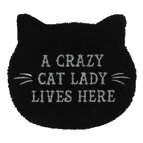 Limited Stock***. Order Securely Now with Next Day Delivery Option Available. Great Deal and Fast Tracked Delivery. Order this Brand New Cat Lady Black Cat Shaped Door Mat. Part Number:FI_74630. Material: Natural Grasses and M-PV. A black coir doormat shaped like a cat face with 'A Crazy Cat Lady Lives Here' text and printed whiskers.Packaged Dimensions: H2cm x W50cm x D45cm